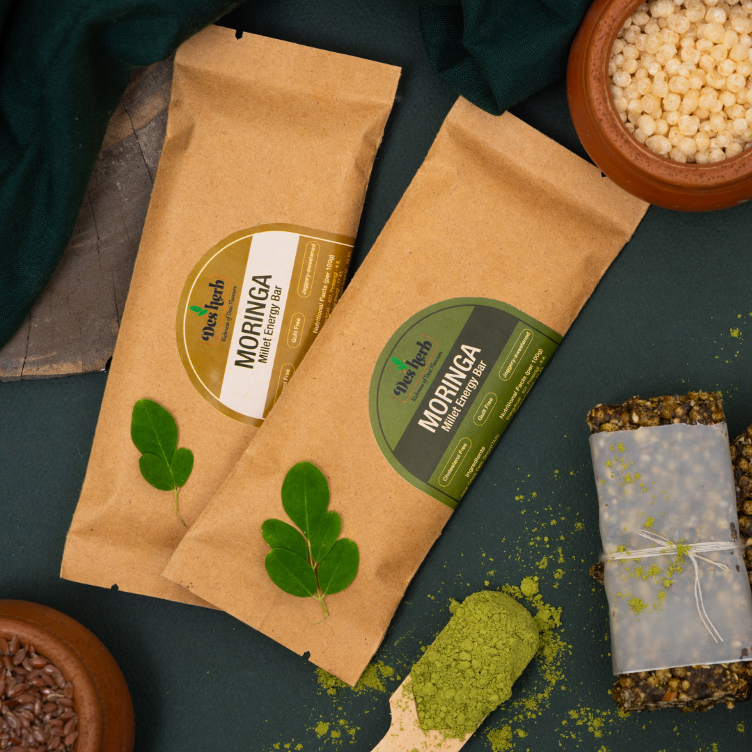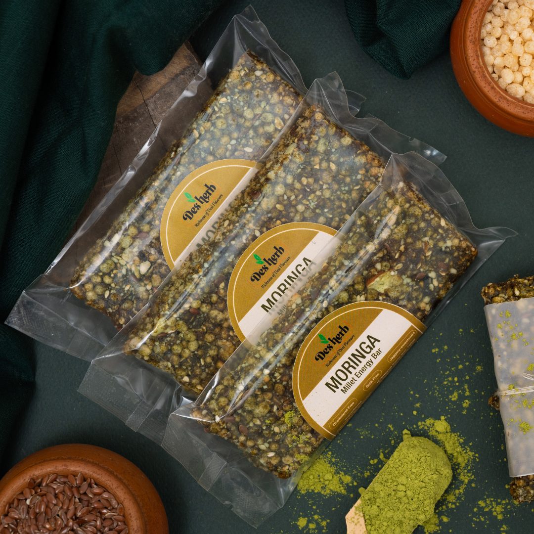 Fuel your day naturally with the Desherb Moringa Millet Bar – a smart, on-the-go snack made from Jowar, flax seeds, sesame, dates, jaggery, and infused with nutrient-rich Moringa. It’s your plant-powered pick-me-up for busy days, workouts, travel, or anytime you need sustained energy without the sugar crash.
