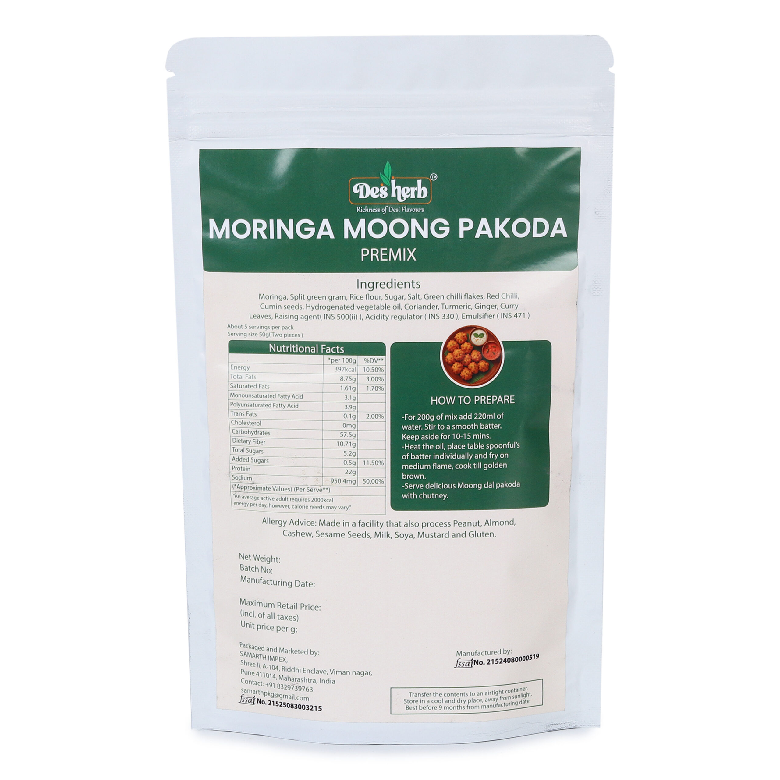 Ingredients : Moringa, Split green gram, Rice flour,Sugar, Salt, Green Chilli flakes, Red chilli, Hydrogenated vegetable oil, coriander, Turmeric, Ginger, Curry leaves, Salt, Cumin seeds