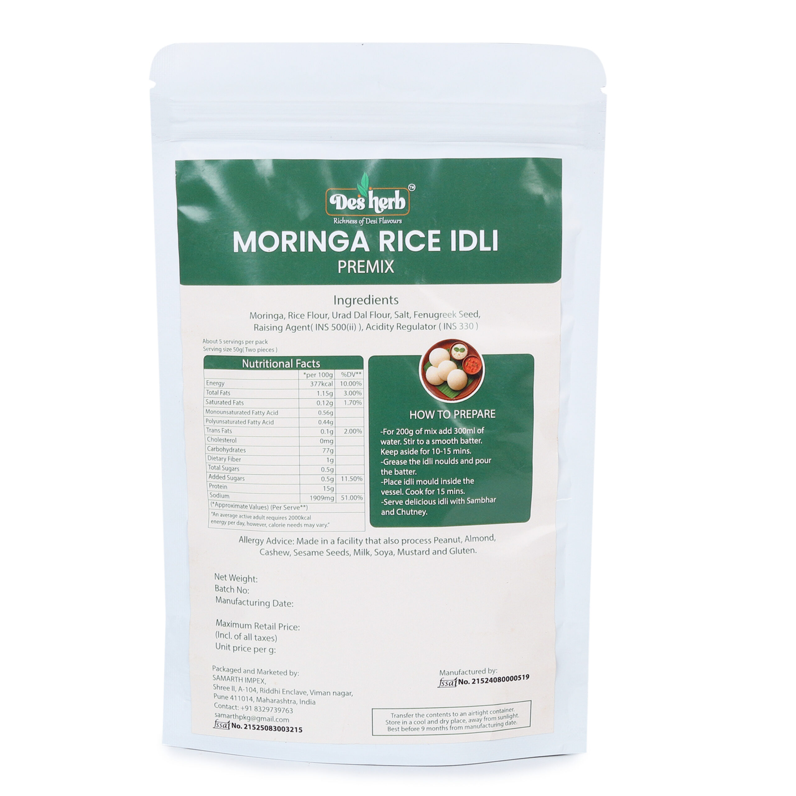 Moringa Rice Idli Premix-Instant Rice Idli Breakfast Mix 250g offers a ready-to-cook blend for making soft and fluffy rice idlis at home. This mix is designed for convenience, providing the essential base for preparing a popular South Indian breakfast. Each 250g pack can make approximately 90 rice idlis, making it suitable for family meals, gatherings, or daily breakfast routines. The mix is pure vegetarian and contains ingredients selected for balanced taste and texture. It can be paired with chutneys, sambar, or other accompaniments to create a complete meal experience. Easy to prepare with minimal steps, this mix is suitable for both beginners and experienced cooks. Simply add water, mix to the right consistency, and steam for delicious idlis. The pack is compact and easy to store, making it a useful addition to the kitchen pantry for quick meal preparation. Whether for a traditional breakfast or a light dinner option, this idli mix brings an authentic touch to home cooking without the need for complex preparation.